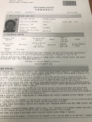 ん?A4判の用紙をもらったがこれがビザらしい。申請から10日間かかったが、私は今まで韓国ビザを取ったことがない。調べたら韓国に100回くらい行っていた。新しい国家プロジェクトもあって、月に一回来てほしいということだが、早くビザがなくなってほしい。コロナ検査もそうだ。行く前に一回、着いて72時間以内に一回、帰るときに一回の検査が必要だ。今回は72時間の検査と出国前の検査を一回でやるが、それでも余計に二泊、検査代で32000円くらいかかる。政府同志がもっと仲良くしたらすぐ実現すると思うが。