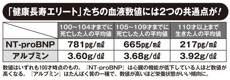 「スーパーセンチナリアン36人を含む100才超え896人の血液データの解析と追跡調査をしたところ、『NT-proBNP』と『アルブミン』という血液検査の項目に健康長寿の秘密があることが明らかになりました。『NT-proBNP』は心臓の機能が低下している人ほど値が高くなる傾向があり、100才の時点で比べると、100~104才で亡くなった人の平均値が781、105~109才で亡くなった人の平均値が665だったのに対し、110才以上まで長生きした人の平均値は217と、明らかに低かったのです」 一方の『アルブミン』はたんぱく質の一種で、栄養状態を示す目安となる数字。成人であれば4以上が正常値で、3.5以下になると低栄養状態だとされている。「100~104才で亡くなった人の100才時点でのアルブミン値は平均で3.6でしたが、110才以上まで生きた人は3.92もあった。この値が低くなると運動機能が落ちて全身が衰弱する『フレイル』と呼ばれる要介護一歩手前の状態に陥るリスクが上がると考えられます」
