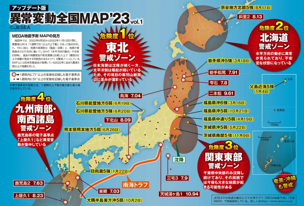 測量学の世界的権威である村井俊治・東大名誉教授は、「MEGA地震予測」で、国土地理院が全国約1300か所に設置した電子基準点のGPSデータなどを使って地表の動きを捉え、1週間ごとの上下動の「異常変動」、長期的な「隆起・沈降」、東西南北の動きの「水平方向の動き」という主な指標を総合的に分析している。村井氏はその予測法をベースにして2020年にAI(人工知能)による危険度判定を導入。2021年には切迫度の高い時に限って発出する「ピンポイント予測」を実用化するなどして、より予測精度を高めた。そんな村井氏が2023年に警戒すべきエリアはどこか。危険度1位から4位までの警戒ゾーンを紹介する。
