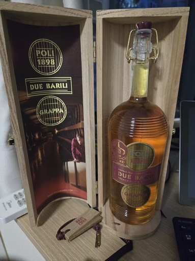 普通は透明なのだが、樽に入れて保存したものは茶色になる。グラッパにしては甘い香りがする。アロマフレーバーだ。こんなグラッパは飲んだことがない。美味い。